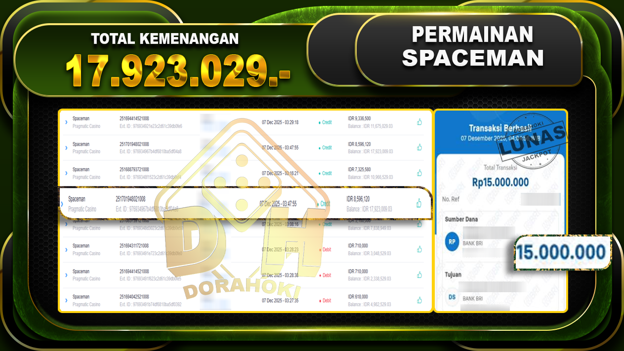 Bukti JP SPACEMAN – ucapkan selamat kepada user id dikxxxx atas kemenangan di SPACEMAN dengan total kemenangan Rp.17,923,029,- . Yang pasti nya langsung LUNAS sesuai bukti ya bosku. Dorahoki nih bosku berapapun akan tetap kami bayar lunas ya bosku.