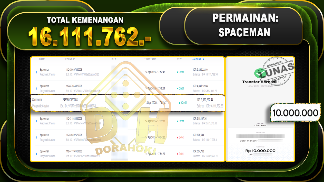 Bukti JP SPACEMAN – ucapkan selamat kepada user id Valxxx atas kemenangan di SPACEMAN dengan total kemenangan Rp.16.111.762,- . Yang pasti nya langsung LUNAS sesuai bukti ya bosku. Dorahoki nih bosku berapapun akan tetap kami bayar lunas ya bosku.