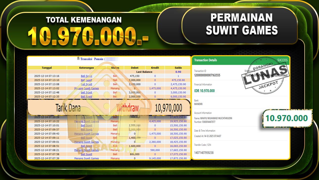 Bukti JP Suwit Games – ucapkan selamat kepada user id gooxxx atas kemenangan di Suwit Games dengan total kemenangan Rp.10,970,000 ,- . Yang pasti nya langsung LUNAS sesuai bukti ya bosku. Dofrahoki nih bosku berapapun akan tetap kami bayar lunas ya bosku.
