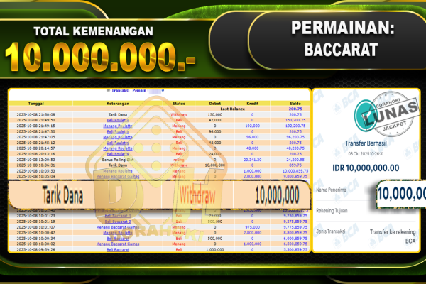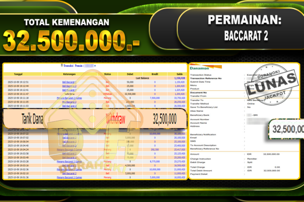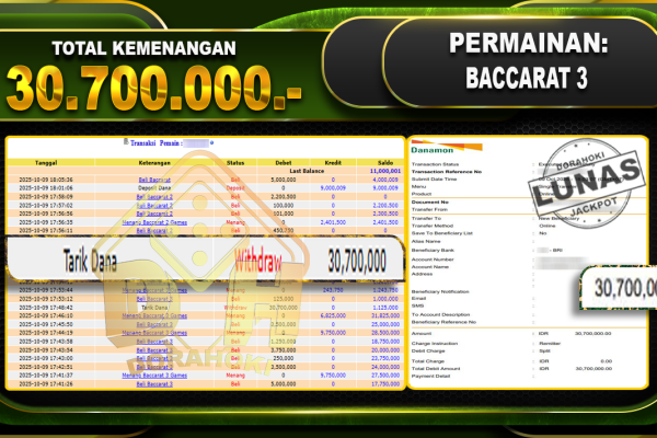 Bukti JP BACCARAT 3 GAMES – ucapkan selamat kepada user id arkxxxxxx atas kemenangan di BACCARAT 3 GAMES dengan total kemenangan Rp.30.700.000,- . Yang pasti nya langsung LUNAS sesuai bukti ya bosku. Dorahoki nih bosku berapapun akan tetap kami bayar lunas ya bosku.