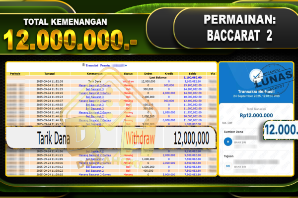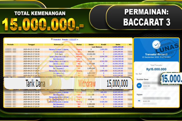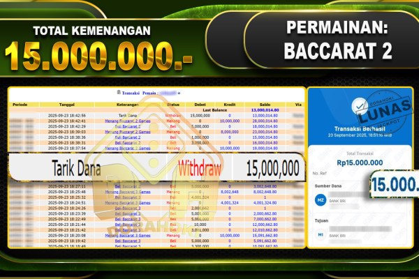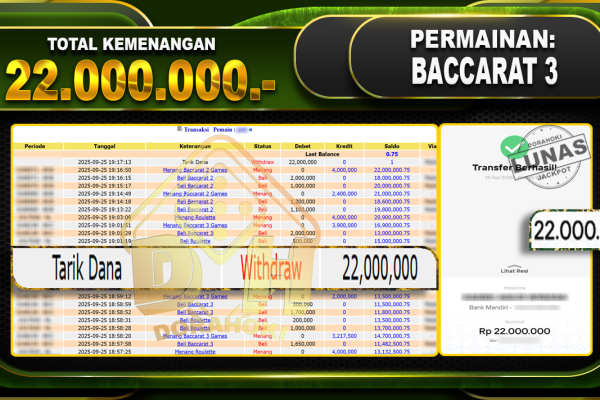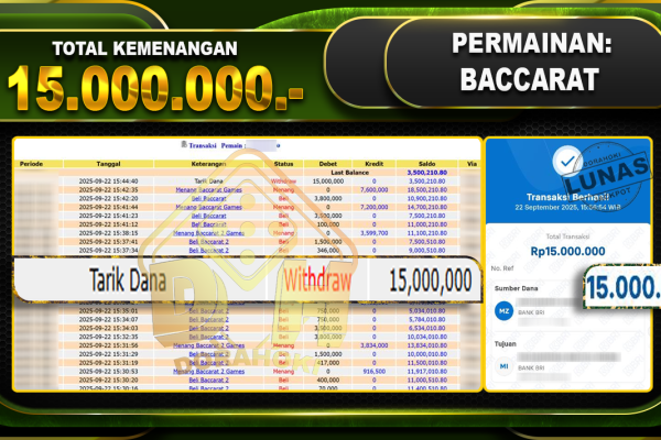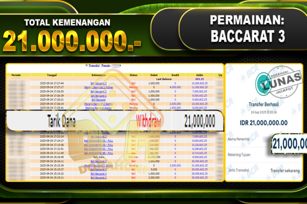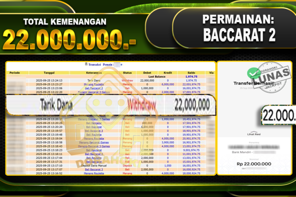 Bukti JP BACCARAT 3 GAMES – ucapkan selamat kepada user id Jikxxx atas kemenangan di BACCARAT 3 GAMES dengan total kemenangan Rp.22.000.000,- . Yang pasti nya langsung LUNAS sesuai bukti ya bosku. Dorahoki nih bosku berapapun akan tetap kami bayar lunas ya bosku.