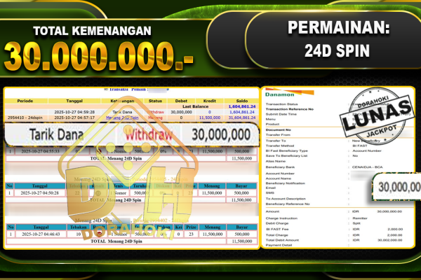 Bukti JP 24Dspin – ucapkan selamat kepada user id junxxxx atas kemenangan di HONGKONG dengan total kemenangan Rp.30.000.000- . Yang pasti nya langsung LUNAS sesuai bukti ya bosku. Dorahoki nih bosku berapapun akan tetap kami bayar lunas ya bosku.