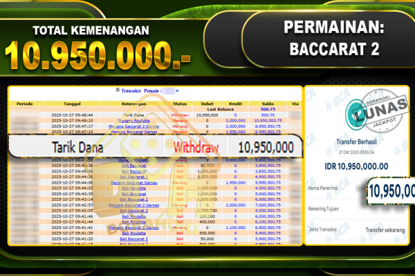 Bukti JP BACCARAT – ucapkan selamat kepada user id asuxxxx atas kemenangan di BACCARAT dengan total kemenangan Rp.10.950.000,- . Yang pasti nya langsung LUNAS sesuai bukti ya bosku. Dorahoki nih bosku berapapun akan tetap kami bayar lunas ya bosku.