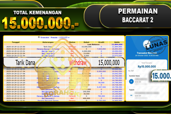 Bukti JP BACCARAT – ucapkan selamat kepada user id arkxxxxx atas kemenangan di BACCARAT dengan total kemenangan Rp.15.000.000,- . Yang pasti nya langsung LUNAS sesuai bukti ya bosku. Dorahoki nih bosku berapapun akan tetap kami bayar lunas ya bosku.