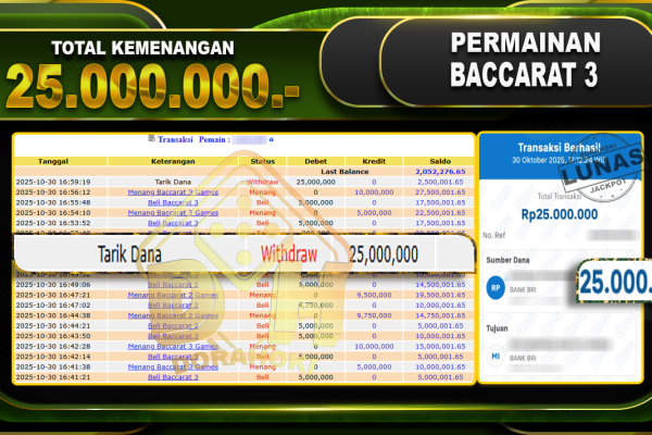 Bukti JP BACCARAT – ucapkan selamat kepada user id arkxxxxx atas kemenangan di BACCARAT dengan total kemenangan Rp.25.000.000,- . Yang pasti nya langsung LUNAS sesuai bukti ya bosku. Dorahoki nih bosku berapapun akan tetap kami bayar lunas ya bosku.