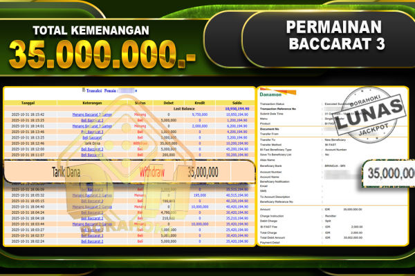 Bukti JP BACCARAT – ucapkan selamat kepada user id arkxxxxx atas kemenangan di BACCARAT dengan total kemenangan Rp.35.000.000,- . Yang pasti nya langsung LUNAS sesuai bukti ya bosku. Dorahoki nih bosku berapapun akan tetap kami bayar lunas ya bosku.