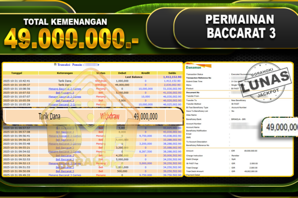 Bukti JP BACCARAT – ucapkan selamat kepada user id arkxxxxx atas kemenangan di BACCARAT dengan total kemenangan Rp.49.000.000,- . Yang pasti nya langsung LUNAS sesuai bukti ya bosku. Dorahoki nih bosku berapapun akan tetap kami bayar lunas ya bosku.