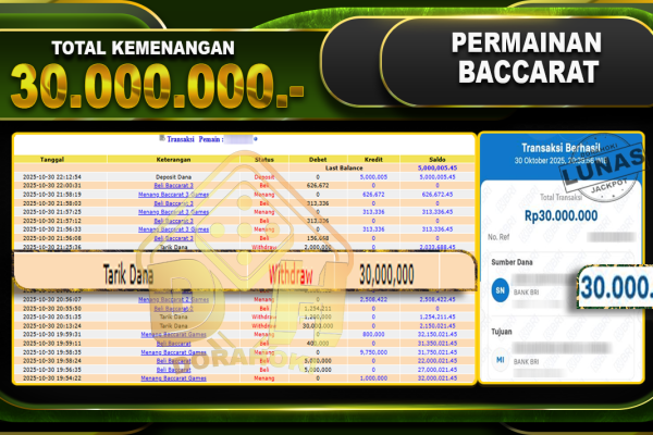 Bukti JP BACCARAT – ucapkan selamat kepada user id arkxxxxx atas kemenangan di BACCARAT dengan total kemenangan Rp.30.000.000,- . Yang pasti nya langsung LUNAS sesuai bukti ya bosku. Dorahoki nih bosku berapapun akan tetap kami bayar lunas ya bosku.