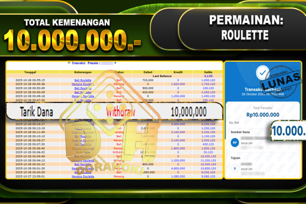 Bukti JP Roulette – ucapkan selamat kepada user id tamxxxxx atas kemenangan di  Roulette  dengan total kemenangan Rp.10.000.000,- Yang pasti nya langsung LUNAS sesuai bukti ya bosku. Dorahoki nih bosku berapapun akan tetap kami bayar lunas ya bosku.