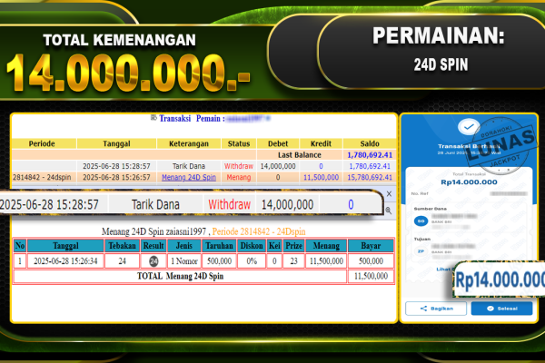 Bukti JP 24D SPIN – ucapkan selamat kepada user id Zaixxx atas kemenangan di 24D SPIN dengan total kemenangan Rp.13.920.000,- . Yang pasti nya langsung LUNAS sesuai bukti ya bosku. Dorahoki nih bosku berapapun akan tetap kami bayar lunas ya bosku.