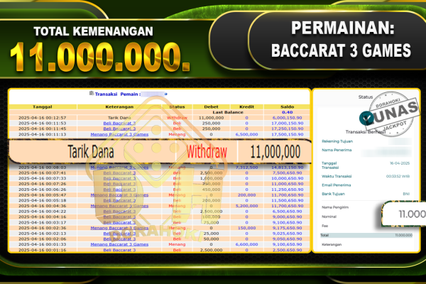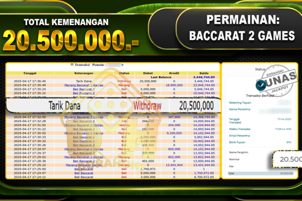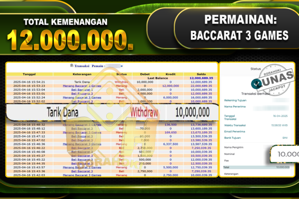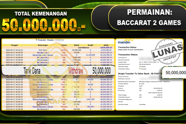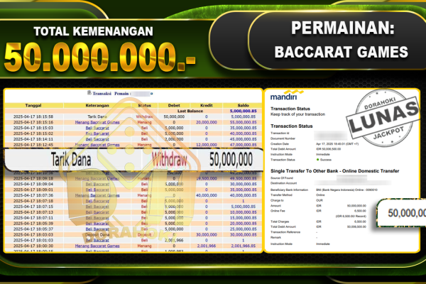 Bukti JP BACCARAT GAMES – ucapkan selamat kepada user id Wahxxx atas kemenangan di BACCARAT GAMES dengan total kemenangan Rp.50.300.000,- . Yang pasti nya langsung LUNAS sesuai bukti ya bosku. Dorahoki nih bosku berapapun akan tetap kami bayar lunas ya bosku. Kami mengucapkan Terima Kasih telah mempercayakan DORAHOKI sebagai Bandar Online pilihan dalam bermain judi online….
