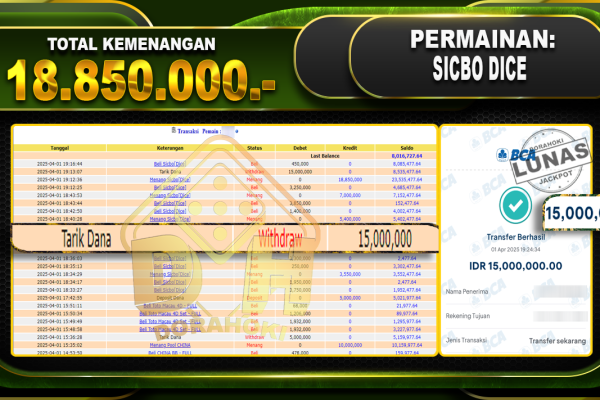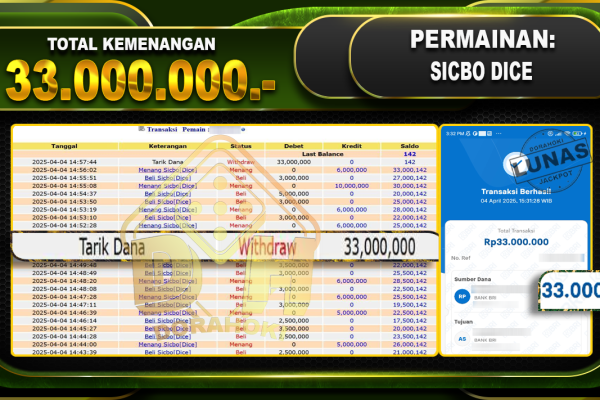 Bukti JP SICBO DICE – ucapkan selamat kepada user id Timxxx atas kemenangan di SICBO DICE dengan total kemenangan Rp.33.000.000,- . Yang pasti nya langsung LUNAS sesuai bukti ya bosku. Dorahoki nih bosku berapapun akan tetap kami bayar lunas ya bosku. Kami mengucapkan Terima Kasih telah mempercayakan DORAHOKI sebagai Bandar Online pilihan dalam bermain judi online….