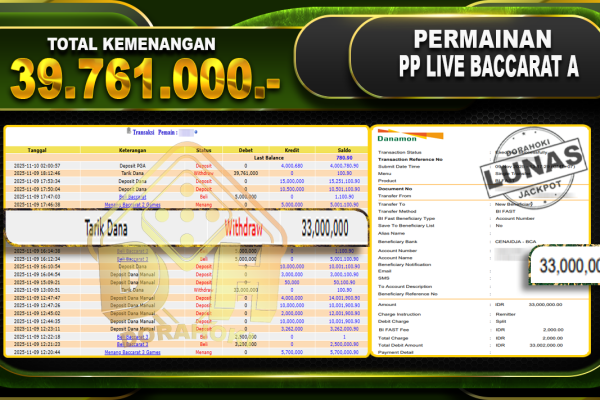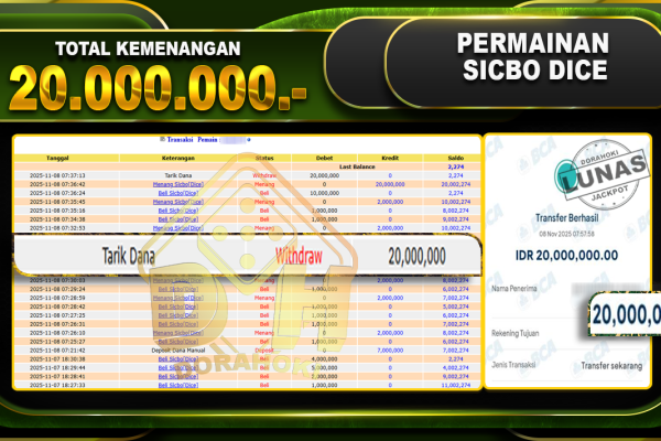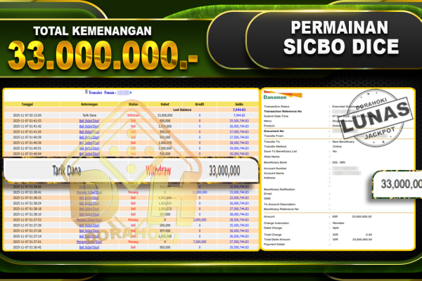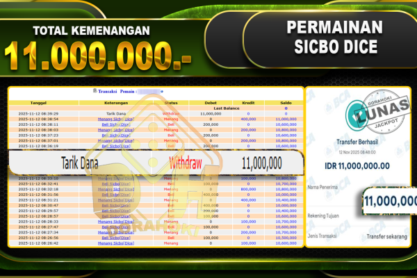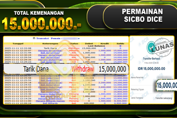Bukti JP Sicbo Dice – ucapkan selamat kepada user id karxxxxx atas kemenangan di Sicbo Dice dengan total kemenangan Rp.11,000,000,- Yang pasti nya langsung LUNAS sesuai bukti ya bosku. Dorahoki nih bosku berapapun akan tetap kami bayar lunas ya bosku.
