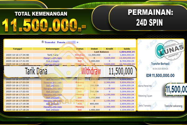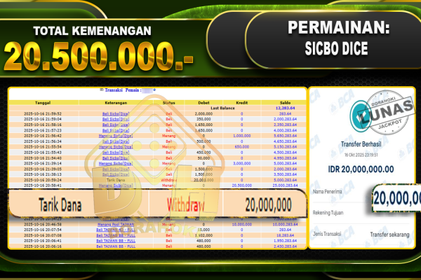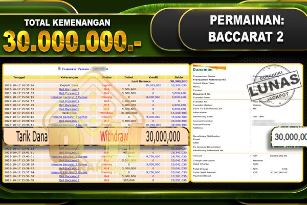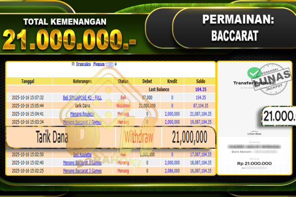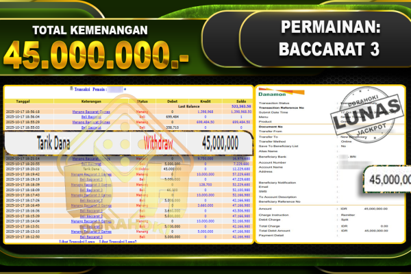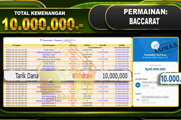 Bukti JP Baccarat – ucapkan selamat kepada user id arkhxxxx atas kemenangan di Baccarat dengan total kemenangan Rp.10.000.000- . Yang pasti nya langsung LUNAS sesuai bukti ya bosku. Dorahoki nih bosku berapapun akan tetap kami bayar lunas ya bosku.