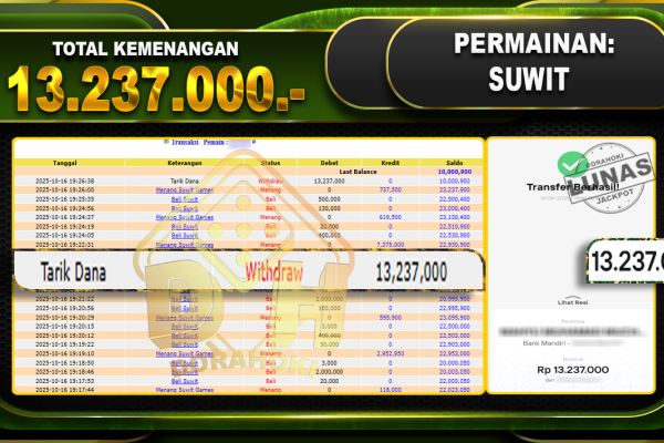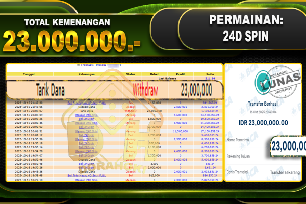 Bukti JP 24D SPIN – ucapkan selamat kepada user id juxxxx atas kemenangan di 24D SPIN dengan total kemenangan Rp.23.000.000,- Yang pasti nya langsung LUNAS sesuai bukti ya bosku. Dorahoki nih bosku berapapun akan tetap kami bayar lunas ya bosku.