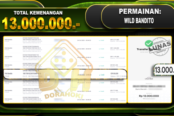 Bukti JP Wild Bandito – ucapkan selamat kepada user id Mahxxxx atas kemenangan di Wild Bandito dengan total kemenangan Rp.13.000.000- . Yang pasti nya langsung LUNAS sesuai bukti ya bosku. Dorahoki nih bosku berapapun akan tetap kami bayar lunas ya bosku.
