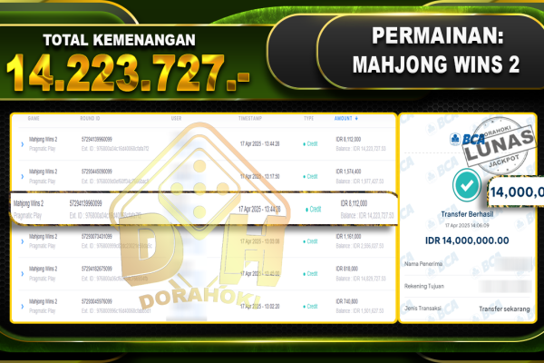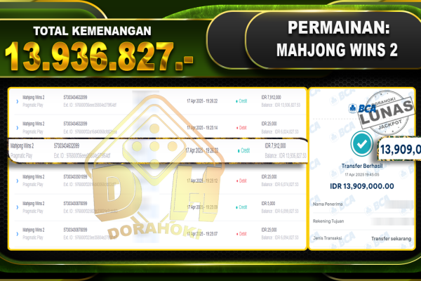 Bukti JP MAHJONG WINS 2 – ucapkan selamat kepada user id Syexxx atas kemenangan di MAHJONG WINS 2 dengan total kemenangan Rp.13.936.827 .,- . Yang pasti nya langsung LUNAS sesuai bukti ya bosku. Dorahoki nih bosku berapapun akan tetap kami bayar lunas ya bosku. Kami mengucapkan Terima Kasih telah mempercayakan DORAHOKI sebagai Bandar Online pilihan…