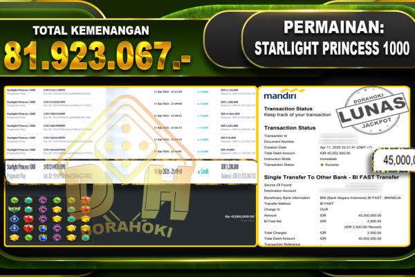 Bukti JP STARLIGHT PRINCESS 1000 – ucapkan selamat kepada user id Jitxxx atas kemenangan di STARLIGHT PRINCESS 1000 dengan total kemenangan Rp.81,923.067,- . Yang pasti nya langsung LUNAS sesuai bukti ya bosku. Dorahoki nih bosku berapapun akan tetap kami bayar lunas ya bosku Kami mengucapkan Terima Kasih telah mempercayakan DORAHOKI sebagai Bandar Online pilihan dalam bermain…