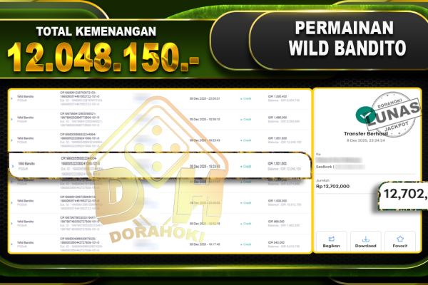 Bukti JP Wild Bandito – ucapkan selamat kepada user id rhaxxxxx atas kemenangan di Wild Bandito dengan total kemenangan Rp.12.048.150.-  Yang pasti nya langsung LUNAS sesuai bukti ya bosku. Dorahoki nih bosku berapapun akan tetap kami bayar lunas ya bosku.