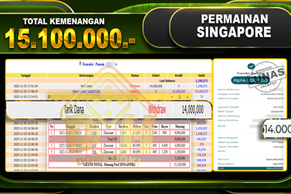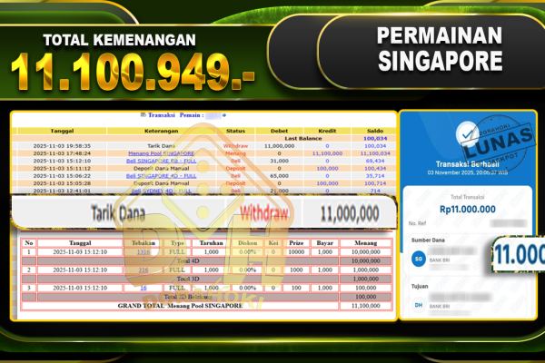Bukti JP TOGEL SINGAPORE – ucapkan selamat kepada user id ajoxxx atas kemenangan di  TOGEL SINGAPORE dengan total kemenangan Rp.11,100,949,- Yang pasti nya langsung LUNAS sesuai bukti ya bosku. Dorahoki nih bosku berapapun akan tetap kami bayar lunas ya bosku