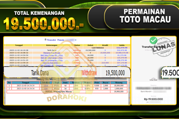 Bukti JP TOGEL TOTO MACAU 4D – ucapkan selamat kepada user id sarxxxxx atas kemenangan di  TOGEL TOTO MACAU 4D dengan total kemenangan Rp.19,500,000,- Yang pasti nya langsung LUNAS sesuai bukti ya bosku. Dorahoki nih bosku berapapun akan tetap kami bayar lunas ya bosku