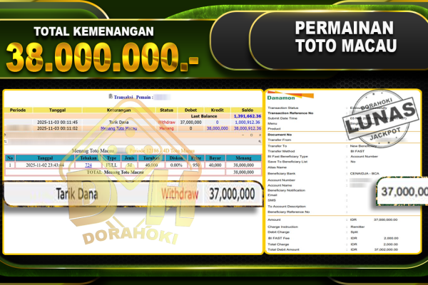 Bukti JP TOGEL TOTO MACAU 4D – ucapkan selamat kepada user id busxxx atas kemenangan di  TOGEL TOTO MACAU 4D dengan total kemenangan Rp.38,000,000,- Yang pasti nya langsung LUNAS sesuai bukti ya bosku. Dorahoki nih bosku berapapun akan tetap kami bayar lunas ya bosku