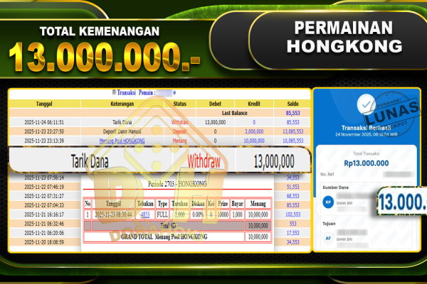 Bukti JP TOGEL HONGKONG – ucapkan selamat kepada user id scaxxxx atas kemenangan di TOGEL HONGKONG dengan total kemenangan Rp.13,000,000,- . Yang pasti nya langsung LUNAS sesuai bukti ya bosku. Dorahoki nih bosku berapapun akan tetap kami bayar lunas ya bosku. Kami mengucapkan Terima Kasih telah mempercayakan DORAHOKI sebagai Bandar Online pilihan dalam bermain judi online….