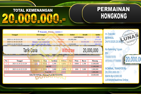 Bukti JP TOGEL HONGKONG – ucapkan selamat kepada user id sinxxxx atas kemenangan di TOGEL HONGKONG dengan total kemenangan Rp.20,000,000,- . Yang pasti nya langsung LUNAS sesuai bukti ya bosku. Dorahoki nih bosku berapapun akan tetap kami bayar lunas ya bosku. Kami mengucapkan Terima Kasih telah mempercayakan DORAHOKI sebagai Bandar Online pilihan dalam bermain judi online….