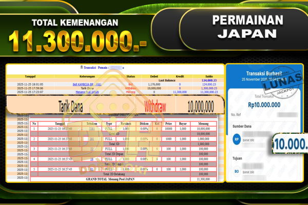 Bukti JP TOGEL JAPAN – ucapkan selamat kepada user id belxxxxx atas kemenangan di  TOGEL JAPAN dengan total kemenangan Rp.11.300.000,- Yang pasti nya langsung LUNAS sesuai bukti ya bosku. Dorahoki nih bosku berapapun akan tetap kami bayar lunas ya bosku