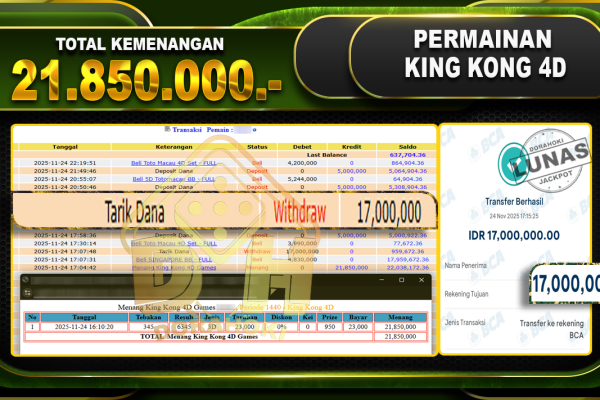 Bukti JP TOGEL KING KONG 4D – ucapkan selamat kepada user id busxx atas kemenangan di  TOGEL KING KONG 4D dengan total kemenangan Rp.21,850,000,- Yang pasti nya langsung LUNAS sesuai bukti ya bosku. Dorahoki nih bosku berapapun akan tetap kami bayar lunas ya bosku