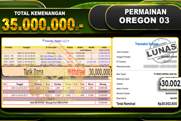 Bukti JP TOGEL OREGON03 – ucapkan selamat kepada user id busxx atas kemenangan di  TOGEL OREGON03 dengan total kemenangan Rp.35.000.000,- Yang pasti nya langsung LUNAS sesuai bukti ya bosku. Dorahoki nih bosku berapapun akan tetap kami bayar lunas ya bosku
