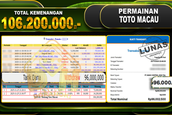 Bukti JP TOGEL TOTO MACAU 4D – ucapkan selamat kepada user id busxx atas kemenangan di  TOGEL TOTO MACAU 4D dengan total kemenangan Rp.106,200,000,- Yang pasti nya langsung LUNAS sesuai bukti ya bosku. Dorahoki nih bosku berapapun akan tetap kami bayar lunas ya bosku