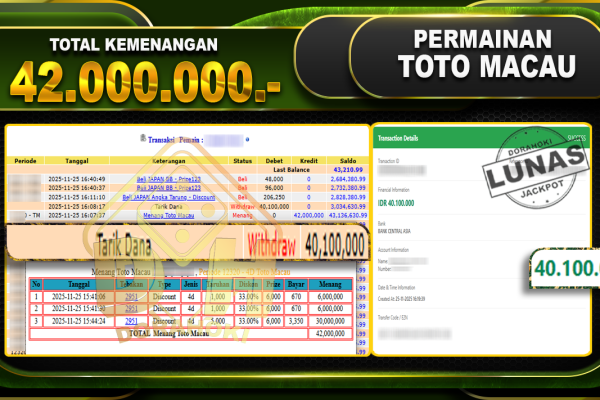 Bukti JP TOGEL TOTO MACAU 4D – ucapkan selamat kepada user id wanxxxxx atas kemenangan di  TOGEL TOTO MACAU 4D dengan total kemenangan Rp.42,000,000,- Yang pasti nya langsung LUNAS sesuai bukti ya bosku. Dorahoki nih bosku berapapun akan tetap kami bayar lunas ya bosku
