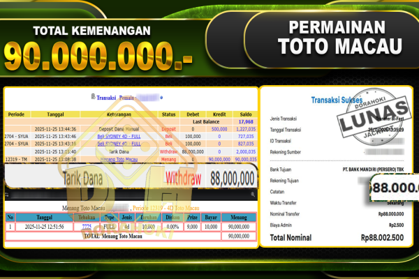 Bukti JP TOGEL TOTO MACAU 4D – ucapkan selamat kepada user id lenxxxxx atas kemenangan di  TOGEL TOTO MACAU 4D dengan total kemenangan Rp.90,000,000,- Yang pasti nya langsung LUNAS sesuai bukti ya bosku. Dorahoki nih bosku berapapun akan tetap kami bayar lunas ya bosku