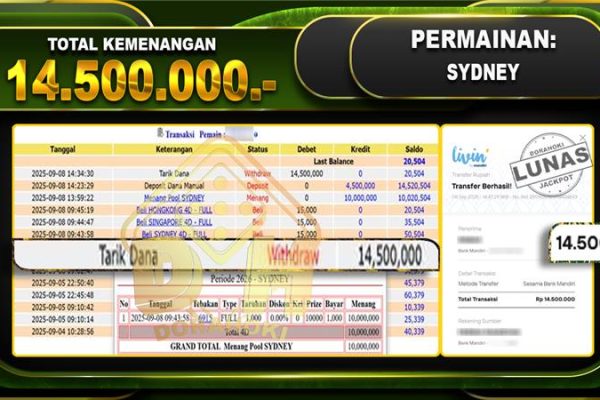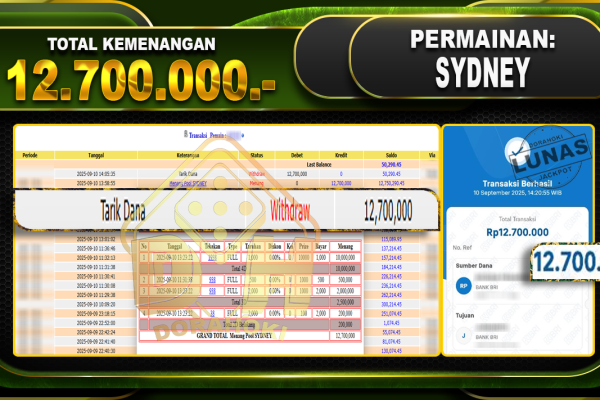 Bukti JP TOGEL SYDNEY – ucapkan selamat kepada user id Jpxxxx atas kemenangan di TOGEL SYDNEY dengan total kemenangan Rp.12,700,000,- Yang pasti nya langsung LUNAS sesuai bukti ya bosku. Dorahoki nih bosku berapapun akan tetap kami bayar lunas ya bosku