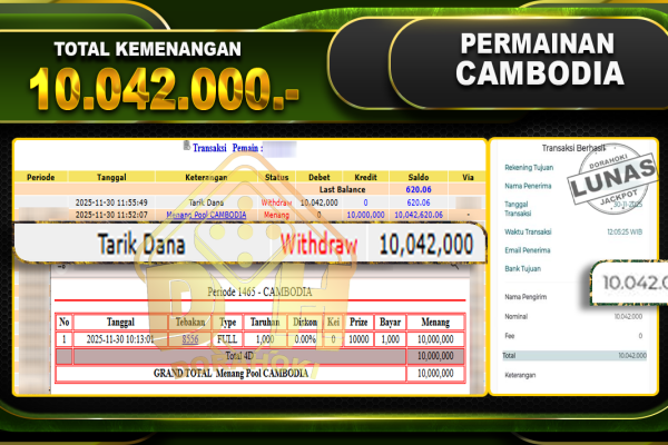 Bukti JP TOGEL CAMBODIA – ucapkan selamat kepada user id jawxxx atas kemenangan di  TOGEL CAMBODIA dengan total kemenangan Rp.10,042,000,- Yang pasti nya langsung LUNAS sesuai bukti ya bosku. Dorahoki nih bosku berapapun akan tetap kami bayar lunas ya bosku