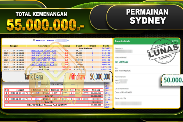Bukti JP TOGEL SYDNEY – ucapkan selamat kepada user id ramxxxxx atas kemenangan di  TOGEL SYDNEY dengan total kemenangan Rp.55,000,000,- Yang pasti nya langsung LUNAS sesuai bukti ya bosku. Dorahoki nih bosku berapapun akan tetap kami bayar lunas ya bosku