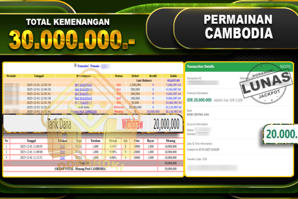 Bukti JP TOGEL CAMBODIA – ucapkan selamat kepada user id gapxx atas kemenangan di  TOGEL CAMBODIA dengan total kemenangan Rp.30,000,000,- Yang pasti nya langsung LUNAS sesuai bukti ya bosku. Dorahoki nih bosku berapapun akan tetap kami bayar lunas ya bosku