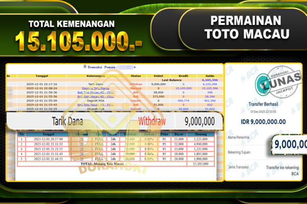 Bukti JP TOGEL TOTO MACAU 4D – ucapkan selamat kepada user id faixxxxx atas kemenangan di  TOGEL TOTO MACAU 4D dengan total kemenangan Rp.15,105,000,- Yang pasti nya langsung LUNAS sesuai bukti ya bosku. Dorahoki nih bosku berapapun akan tetap kami bayar lunas ya bosku