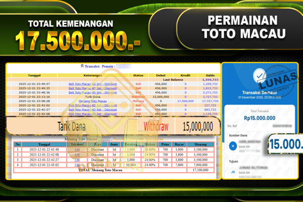 Bukti JP TOGEL TOTO MACAU 4D – ucapkan selamat kepada user id saoxxxxx atas kemenangan di  TOGEL TOTO MACAU 4D dengan total kemenangan Rp.17,500,000,- Yang pasti nya langsung LUNAS sesuai bukti ya bosku. Dorahoki nih bosku berapapun akan tetap kami bayar lunas ya bosku