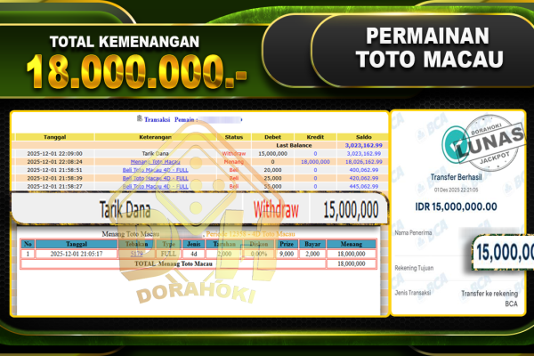Bukti JP TOGEL TOTO MACAU 4D – ucapkan selamat kepada user id wanxxxxx atas kemenangan di  TOGEL TOTO MACAU 4D dengan total kemenangan Rp.18,000,000,- Yang pasti nya langsung LUNAS sesuai bukti ya bosku. Dorahoki nih bosku berapapun akan tetap kami bayar lunas ya bosku