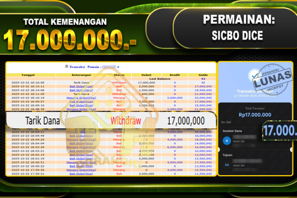 Bukti JP Sicbo Dice – ucapkan selamat kepada user id timxxxxx atas kemenangan di Sicbo Dice dengan total kemenangan Rp.17,000,000,- Yang pasti nya langsung LUNAS sesuai bukti ya bosku. Dorahoki nih bosku berapapun akan tetap kami bayar lunas ya bosku.