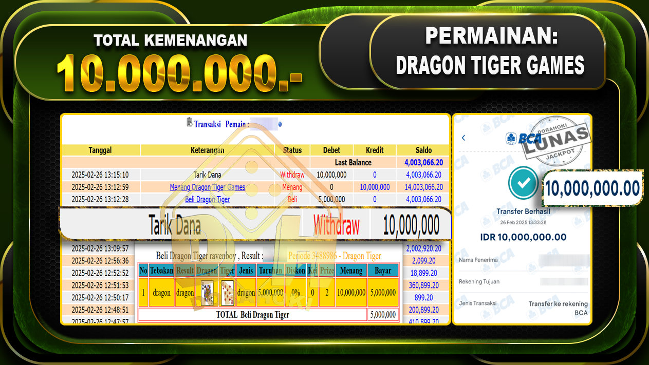 Bukti JP DRAGON TIGER – ucapkan selamat kepada user id Ravxxx atas kemenangan di DRAGON TIGER dengan total kemenangan Rp.10.000.000,- . Yang pasti nya langsung LUNAS sesuai bukti ya bosku. Dorahoki nih bosku berapapun akan tetap kami bayar lunas ya bosku.