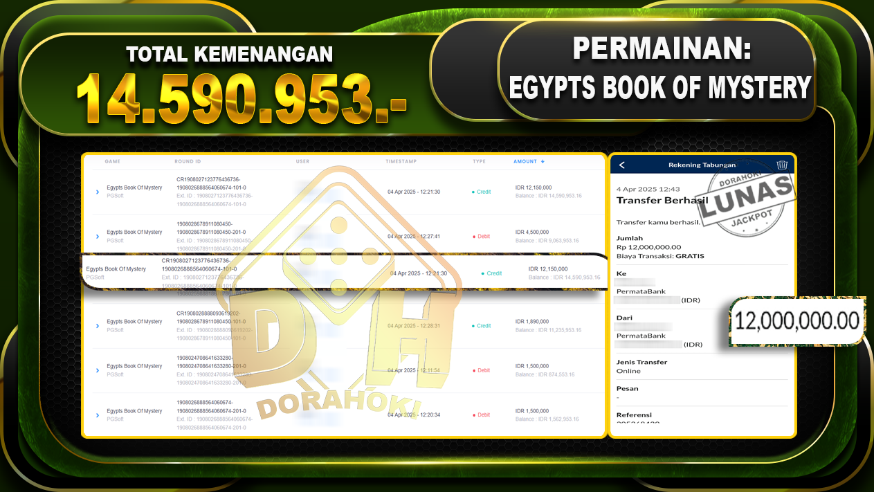 Bukti JP Egypts Book Of Mystery – ucapkan selamat kepada user id Razxxx atas kemenangan di Egypts Book Of Mystery dengan total kemenangan Rp.14,590,953,- . Yang pasti nya langsung LUNAS sesuai bukti ya bosku. Dorahoki nih bosku berapapun akan tetap kami bayar lunas ya bosku.