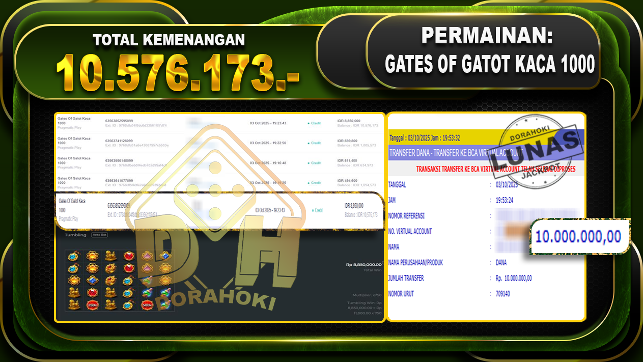 Bukti JP Gates Of Gatot Kaca 1000 – ucapkan selamat kepada user id 07bxxxx atas kemenangan di Gates Of Gatot Kaca 1000 dengan total kemenangan Rp.10,576,173,- Yang pasti nya langsung LUNAS sesuai bukti ya bosku. Dorahoki nih bosku berapapun akan tetap kami bayar lunas ya bosku.
