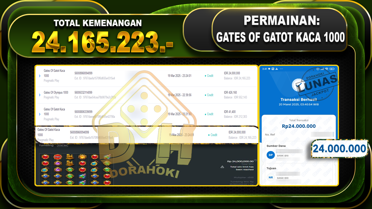 Bukti JP Gates Of Gatot Kaca 1000 – ucapkan selamat kepada user id Nasxxx atas kemenangan di Gates Of Gatot Kaca 1000 dengan total kemenangan Rp.24.165.223,- . Yang pasti nya langsung LUNAS sesuai bukti ya bosku. Dorahoki nih bosku berapapun akan tetap kami bayar lunas ya bosku.