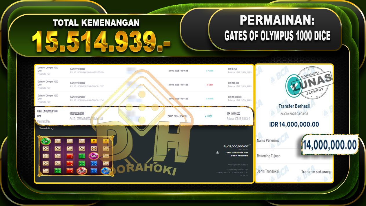 Bukti JP GATES OF OLYMPUS 1000 DICE – ucapkan selamat kepada user id kopxxx atas kemenangan di GATES OF OLYMPUS 1000 DICE dengan total kemenangan Rp.15.514.939,- . Yang pasti nya langsung LUNAS sesuai bukti ya bosku. Dorahoki nih bosku berapapun akan tetap kami bayar lunas ya bosku.