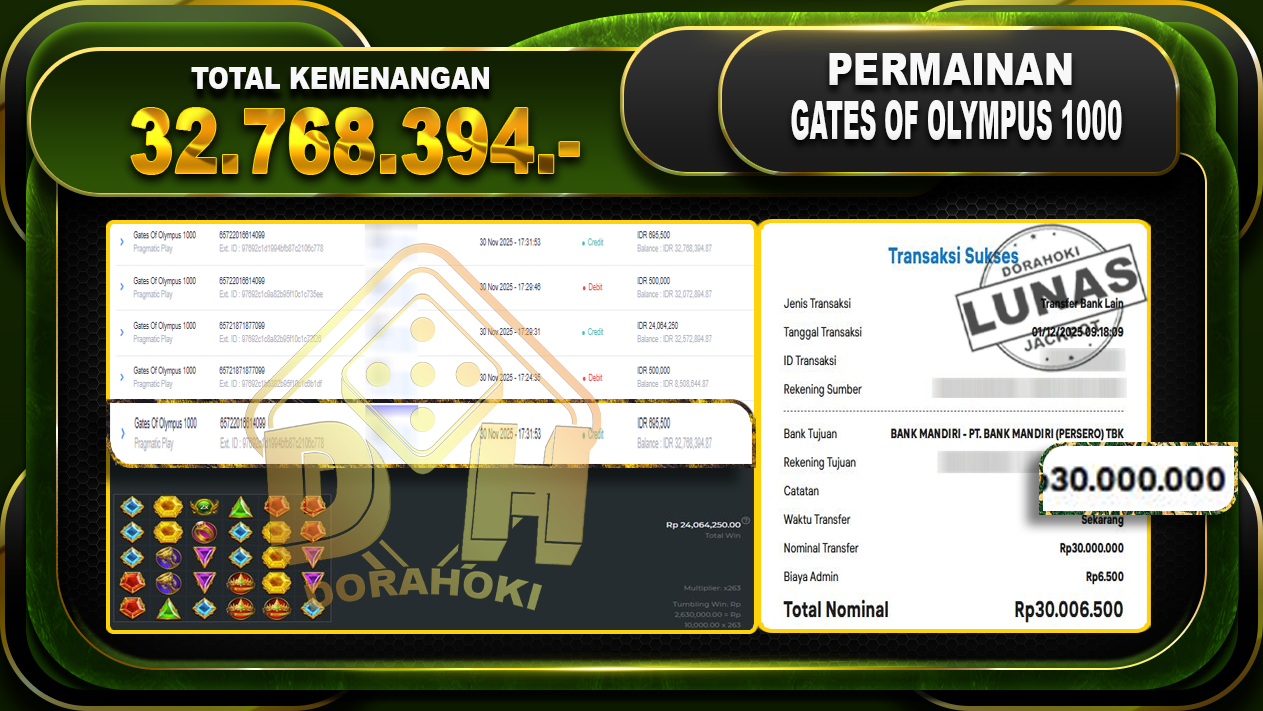 Bukti JP Gates Of Olympus 1000 – ucapkan selamat kepada user id benxxx atas kemenangan di Gates Of Olympus 1000 dengan total kemenangan Rp.32.768.394,- Yang pasti nya langsung LUNAS sesuai bukti ya bosku. Dorahoki nih bosku berapapun akan tetap kami bayar lunas ya bosku