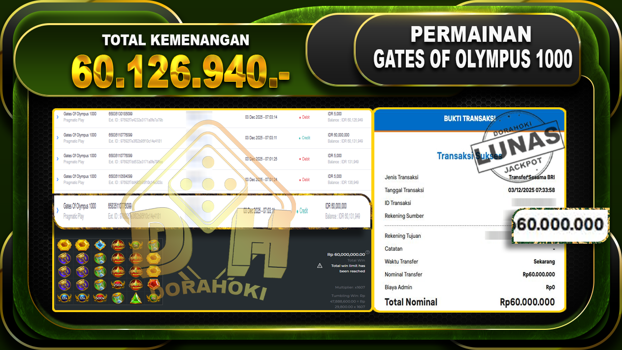 Bukti JP Gates Of Olympus 1000 – ucapkan selamat kepada user id yakxxxxx atas kemenangan di Gates Of Olympus 1000 dengan total kemenangan Rp.60.126.940,- Yang pasti nya langsung LUNAS sesuai bukti ya bosku. Dorahoki nih bosku berapapun akan tetap kami bayar lunas ya bosku