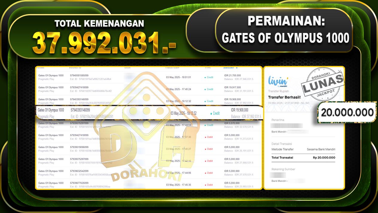 Bukti JP GATES OF OLYMPUS 1000 – ucapkan selamat kepada user id Dogxxx atas kemenangan di GATES OF OLYMPUS 1000 dengan total kemenangan Rp.37.992.031,- . Yang pasti nya langsung LUNAS sesuai bukti ya bosku. Dorahoki nih bosku berapapun akan tetap kami bayar lunas ya bosku.